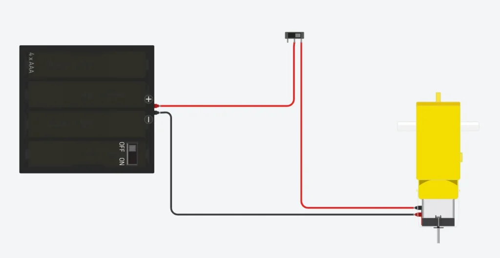 En este método no se utiliza Arduino. Simplemente conectas el motor DC a la fuente de alimentación a través de un switch mecánico. Cuando cierras el circuito con el switch, el motor recibe la tensión y gira. Al abrir el switch, el motor se apaga. Es la forma más simple de control, ideal para pruebas básicas de funcionamiento de motores y comprobación de polaridad de giro sin necesidad de programación ni componentes adicionales.