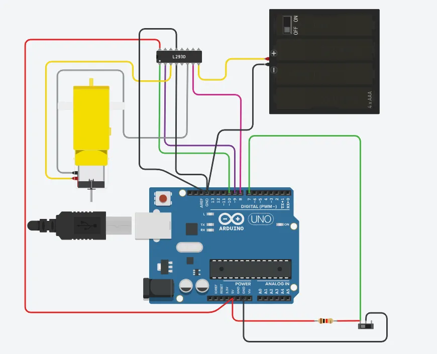 En este método implementamos control completo de un motor DC, combinando el control de giro (dirección) mediante un switch y el control de velocidad con un potenciómetro. El potenciómetro, conectado al pin analógico A0, ajustará la velocidad enviando una señal PWM al Enable1 (EN1) del L293D. El switch, conectado al pin digital 7, invertirá la dirección de giro del motor. Este sistema es ideal para proyectos de robótica donde se requiere movimiento controlado y cambio de sentido dinámico.